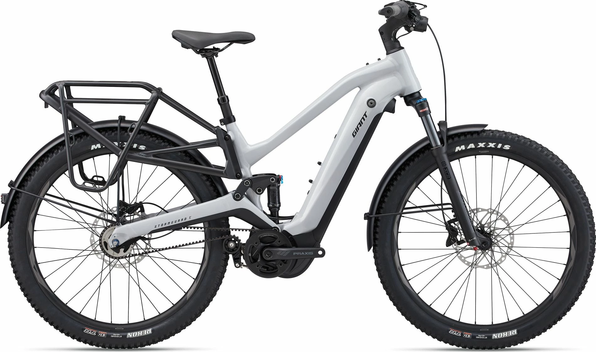 La suspension intégrale du Giant Stormguard E+ 2 2023 avec débattement de 100 mm avant / arrière permet d’absorber les chocs et vibrations du terrain. Son porte-bagages arrière flottant unique est fixé au cadre principal, permettant à la roue arrière de se déplacer à l’aide de son débattement sans affecter le chargement du porte-bagages (jusqu’à 20 kg). La suspension maintient les pneus en contact avec le sol, même sur les routes accidentées ou les chemins de terre.