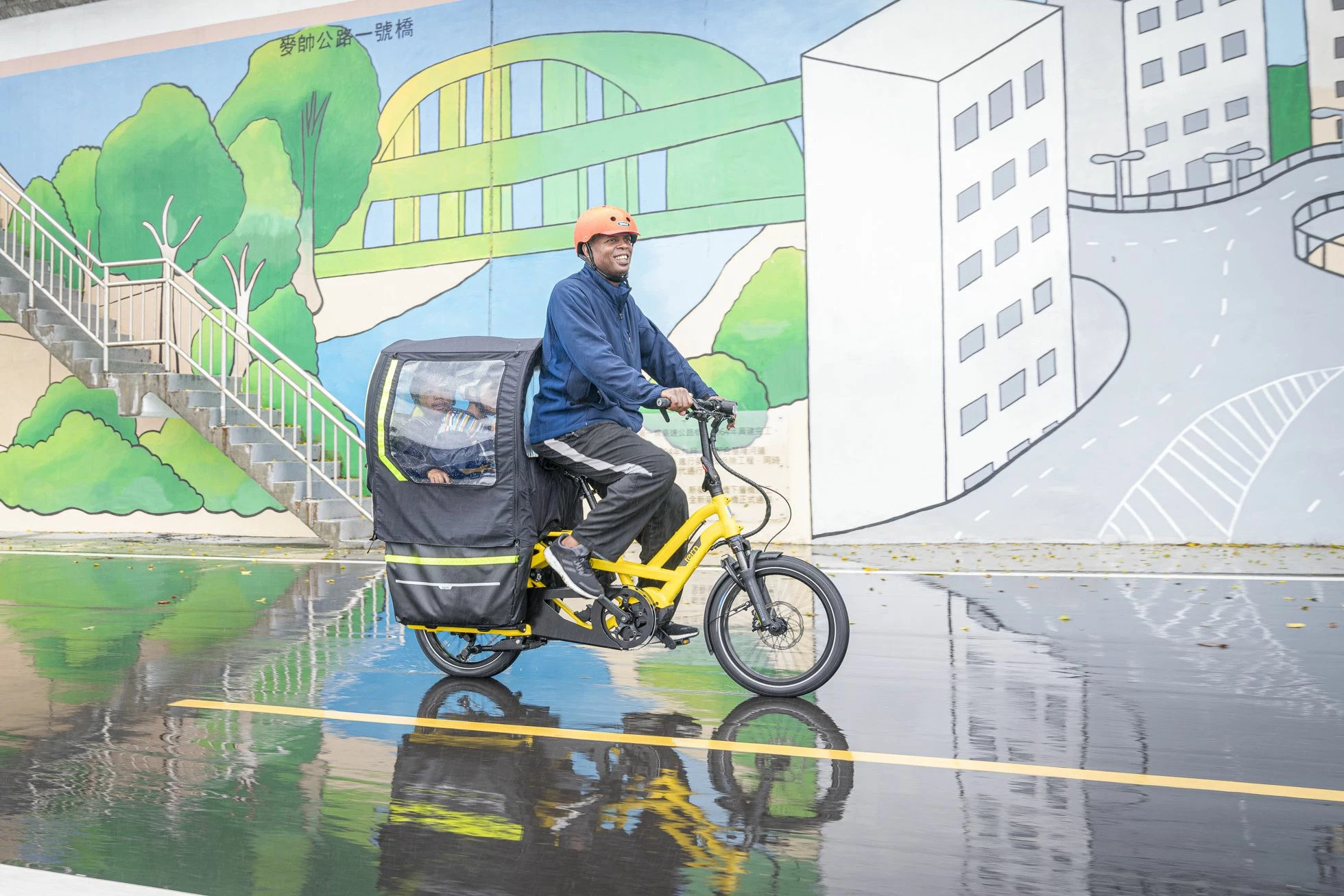 Des éléments latéraux enroulables permettent d’ouvrir et de ventiler le Tern Storm Shield. L’arrière est doté d’éléments jaunes et réfléchissants pour améliorer la visibilité par les autres usagers et donc la sécurité. Le Tern Storm Shield convient aux enfants jusqu’à 1m40.